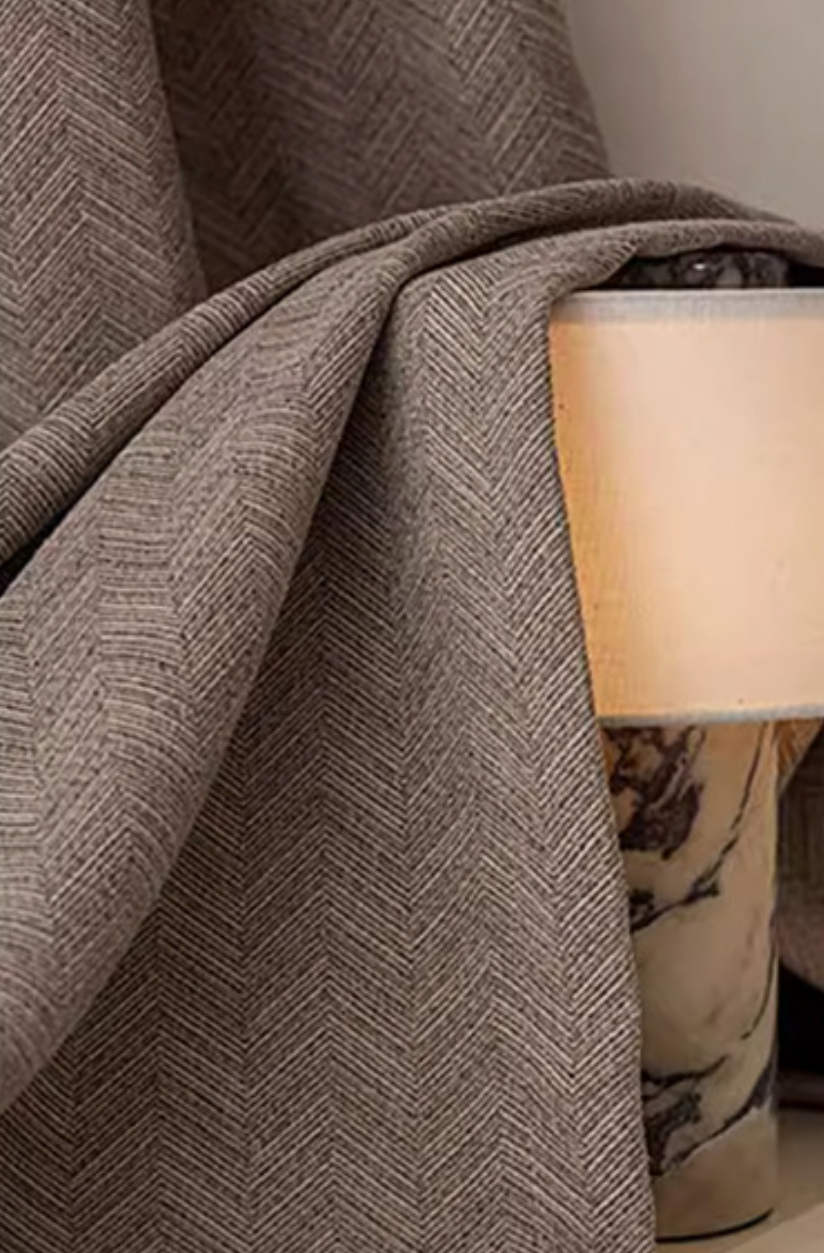 Rideau occultant gris taupe chenille chevrons herringbone salon
