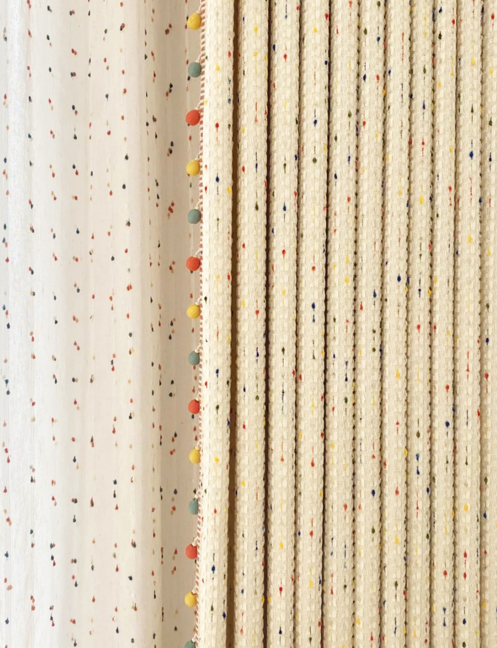 Voilage enfant blanc pois colorés pompons chambre joyeuse sur Mesure